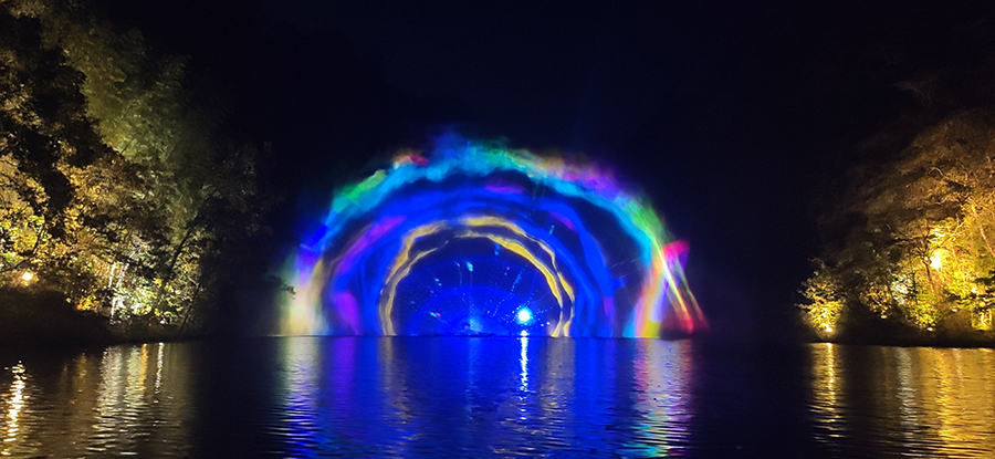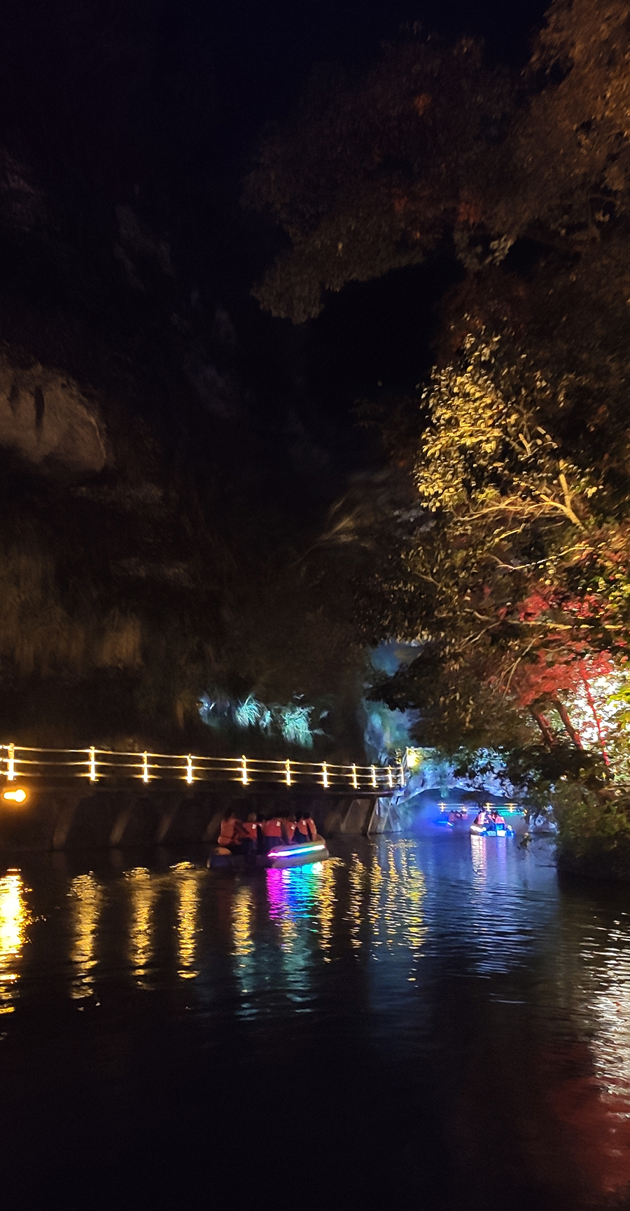 入夜,黨支部一行來到本次文旅最精彩的項目:“夜游九龍潭”。以“夜游九龍潭,靜享夜的美”為主題的“行進式”水上峽谷夜游景區,利用現代化聲光技術與景區自然美景有機融合,讓您充分感受“詩意山水,光影幻境”。聽蛙唱蟲奏,觀月下仙境,月光映水,水波映月,加上臨水棧道邊笛聲陣陣......讓您真切的領會空靈、幽靜、夢幻的別樣意境。一路的聲光風景讓人目不暇接,如果不是身臨其境,絕對感受不到那光影與大自然結合產生的絕妙意境。