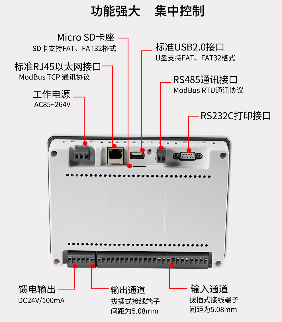 彩色無紙記錄儀/溫度記錄儀采用新型大規(guī)模集成電路,對輸入、輸出、電源、信號采取可靠保護(hù)和強(qiáng)抗干擾設(shè)計。8路萬能信號輸入(可組態(tài)選擇輸入:標(biāo)準(zhǔn)電壓、標(biāo)準(zhǔn)電流、熱電偶、熱電阻、頻率、毫伏等)??蓭?路報警輸出,1個饋電輸出,RS485通訊接口,以太網(wǎng)接口,微型打印機(jī)接口和USB接口,SD卡插座。